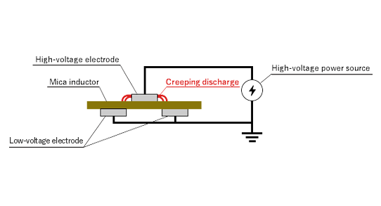 The static eliminator developed by Okabe Mica uses mica as a dielectric, and high and low voltage electrodes are arranged on both sides of the mica. High voltage was applied between these electrodes to cause creeping discharge. Ions were generated through this discharge.