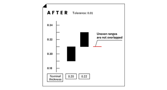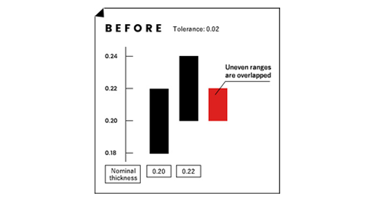 In the past, the lineup and tolerance were ±0.02 mm for each 0.1 mm, so it was necessary to improve the thickness accuracy in order to achieve the customer’s request.